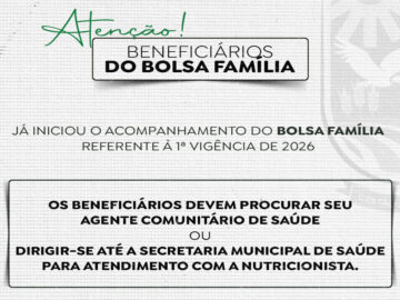 A Secretaria Municipal de Saúde informa que já iniciou a pesagem obrigatória do Programa Bolsa Família, referente à 1ª Vigência de 2026. O acompanhamento é uma das condicionalidades do programa e deve ser realizado pelos beneficiários dentro do prazo... leia mais