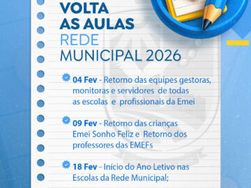 A Prefeitura Municipal, por meio da Secretaria de Educação, divulgou o calendário oficial de retorno das atividades da Rede Municipal de Ensino para o ano letivo de 2026. De acordo com o cronograma, no dia 04 ocorrerá o retorno... leia mais