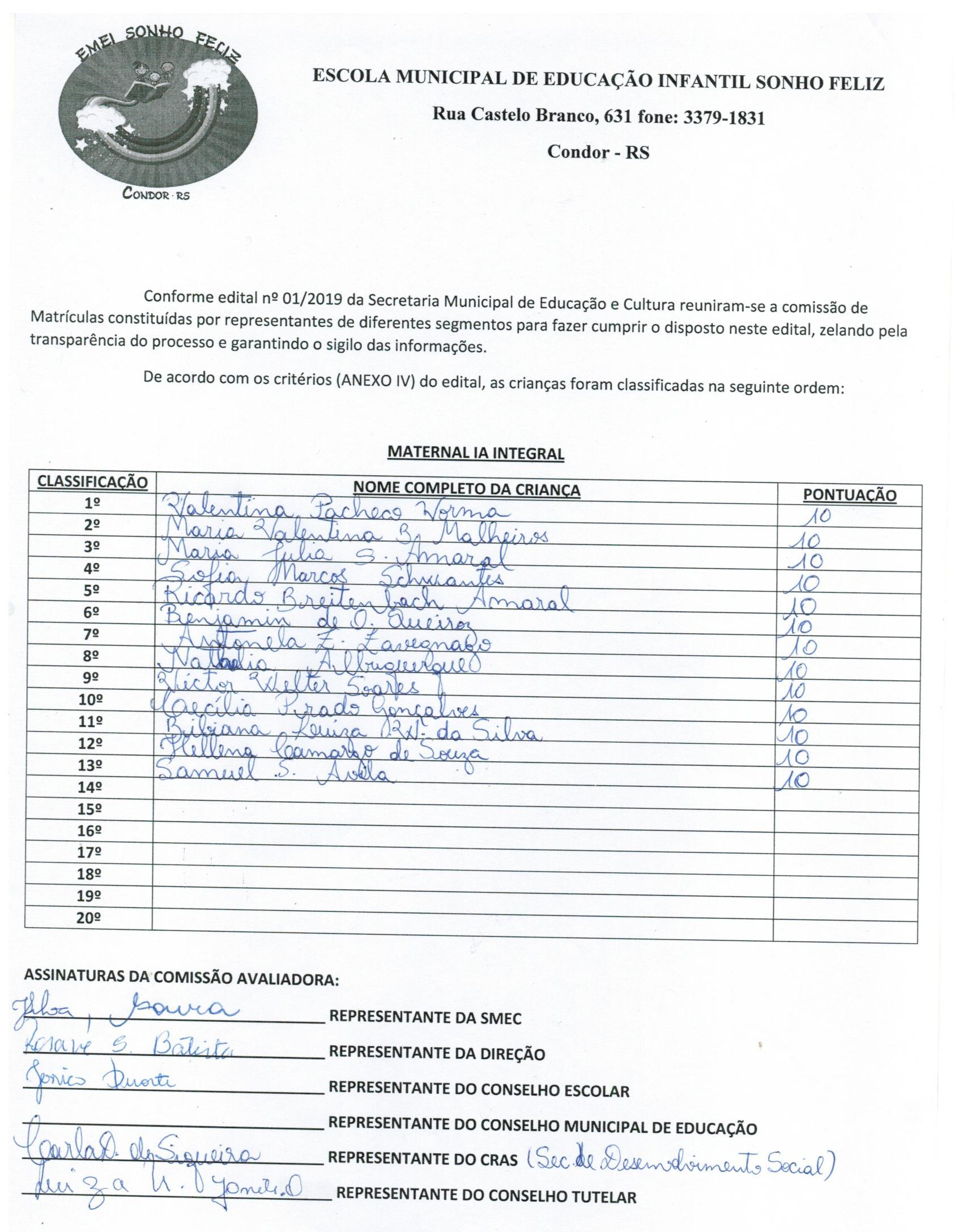 Conforme o Edital 001/2019, aconteceu na EMEI Sonho Feliz, dia 05/12/2019, às 18h30min, a Reunião da Comissão de Matrículas, que realiza a conferência das inscrições e documentação, para preenchimento das vagas das turmas de Maternais 1, 2 e 3 da EMEI Sonho Feliz, para o ano de 2020.