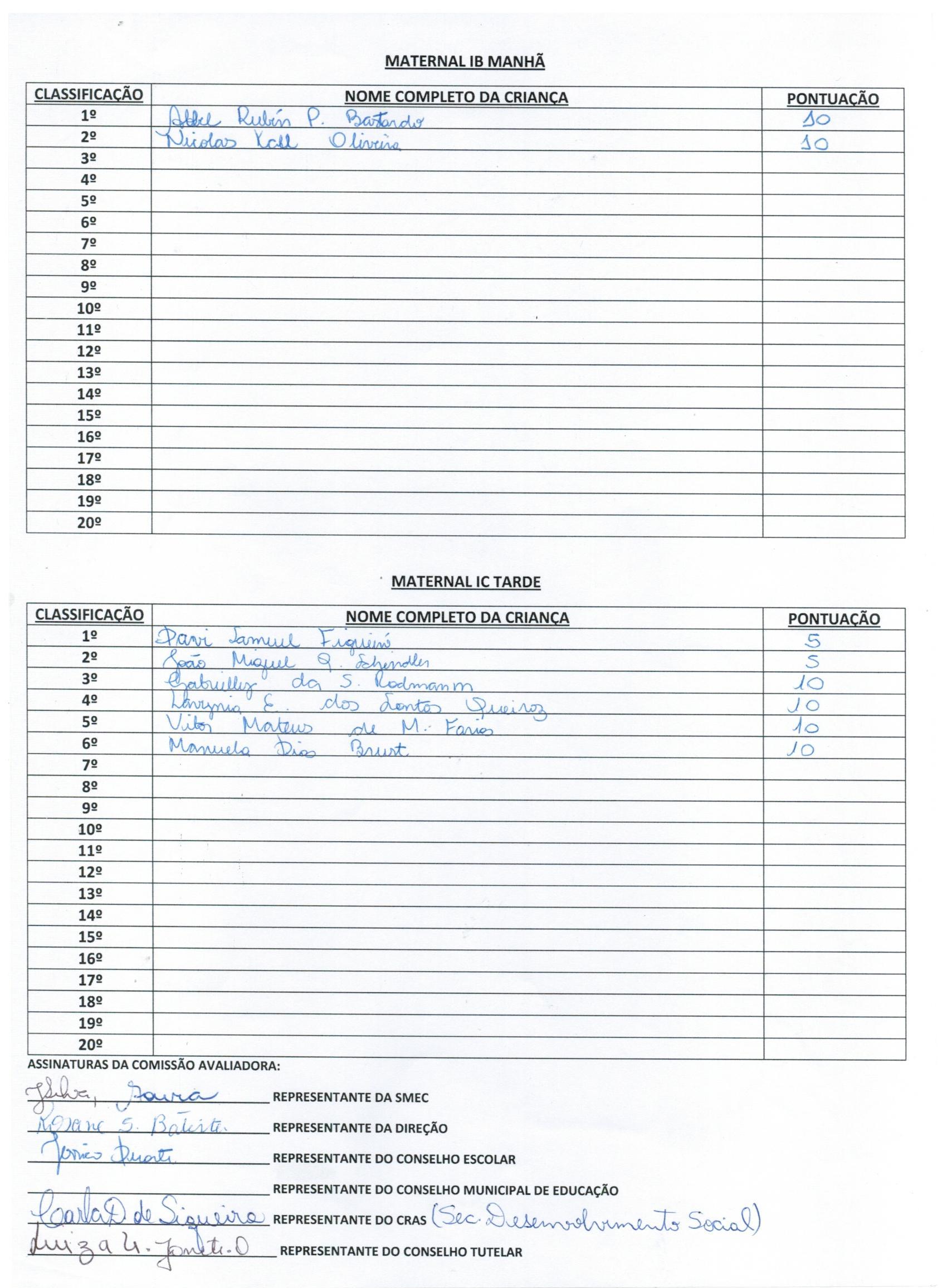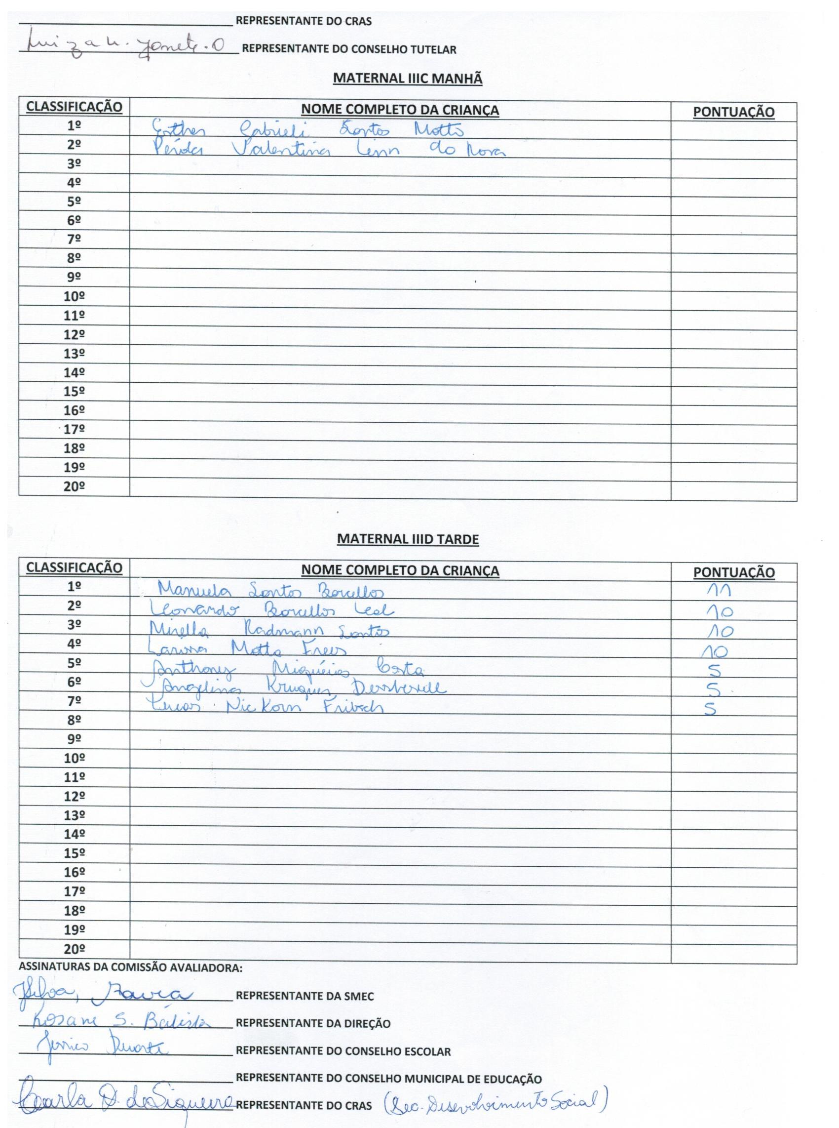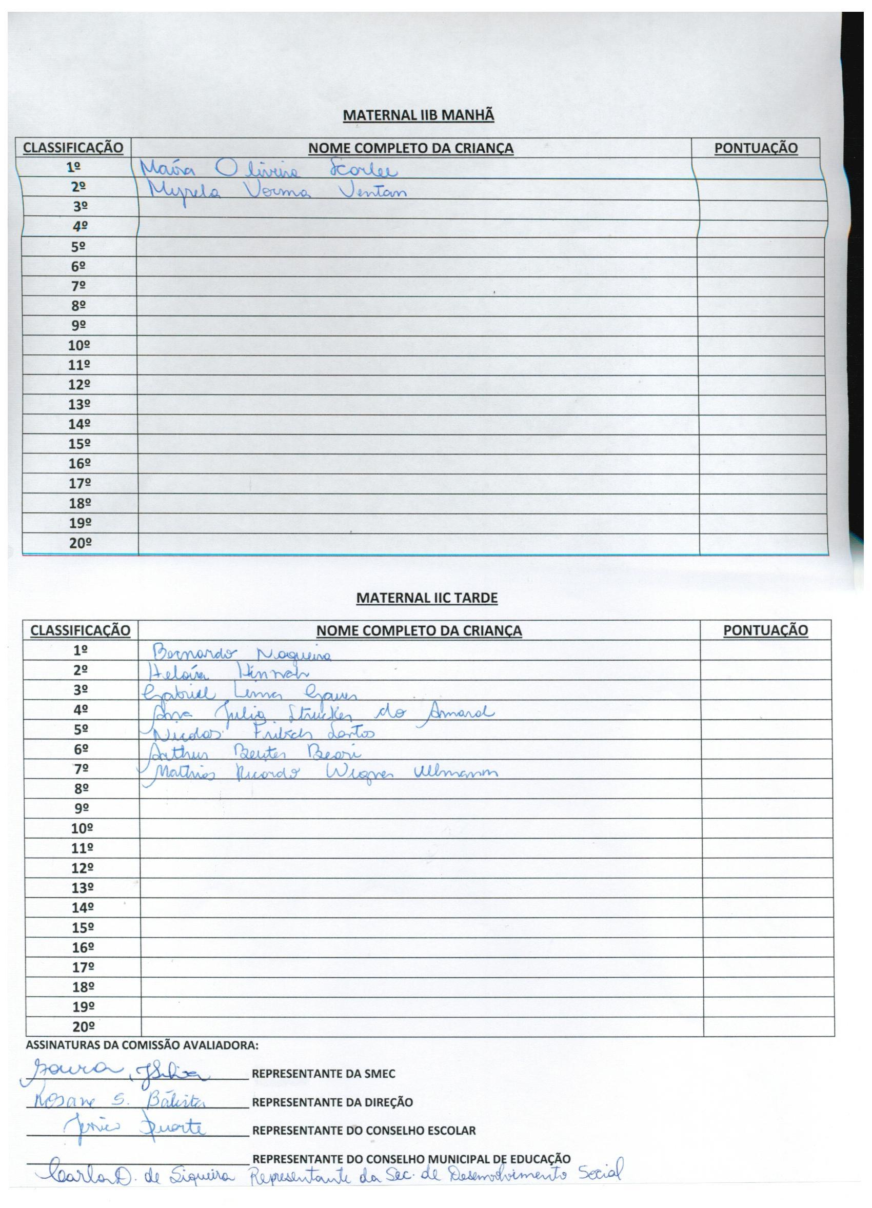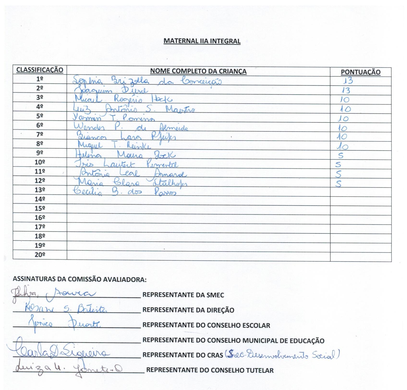 Imagem 1 – Maternal 1 A Integral (10 vagas) – 1º ao 10º lugar tem vaga garantida, mediante a realização da matrícula, 11º ao 13º suplentes, podendo solicitar as vagas que sobraram nos turnos parciais (manhã ou tarde), de acordo com a ordem de classificação.