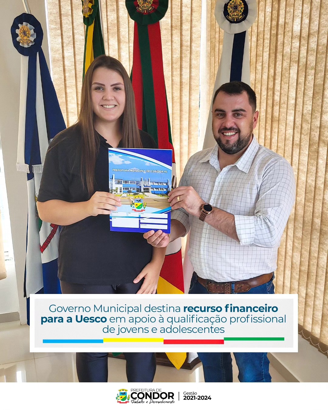 O vice-prefeito Rômulo Teixeira Carvalho e a presidente da União dos Estudantes Superiores de Condor – Uesco, Yasmin Barcelos, formalizaram na tarde de quarta-feira (24) a assinatura do termo de fomento que viabiliza mais um apoio financeiro da prefeitura em benefício à entidade.