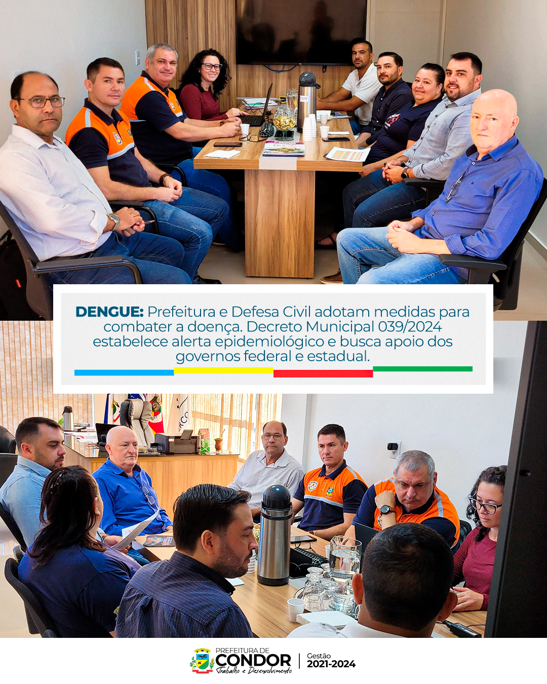 Ao observar aumento no número de casos positivos de dengue em diversos bairros, a Prefeitura de Condor adotou uma série de medidas para combater a doença. Ontem, segunda-feira (11), foi publicado o decreto 039/2024, que declara “Situação de Emergência e Alerta Epidemiológico no Município”. E também seguem sendo realizadas ações preventivas e de aplicação de inseticidas, que se complementam com a atualização da Vigilância Ambiental da Secretaria Municipal de Saúde.